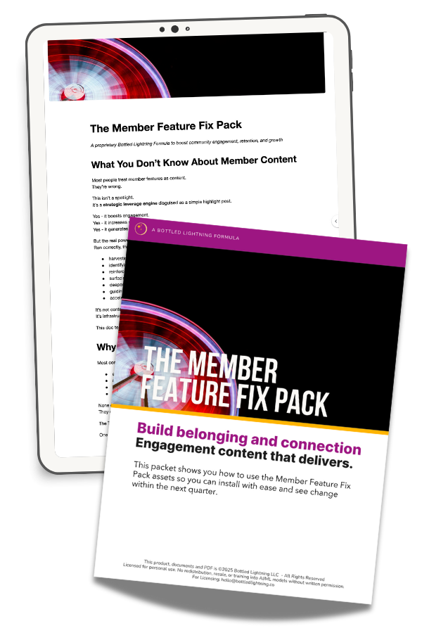 The Member Feature Fix Pack distills the system used inside multi‑million‑dollar communities and lean, high‑touch groups alike: a repeatable way to make your members visible without overwhelming your team.