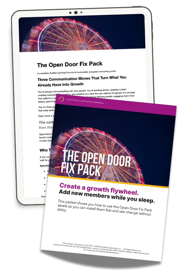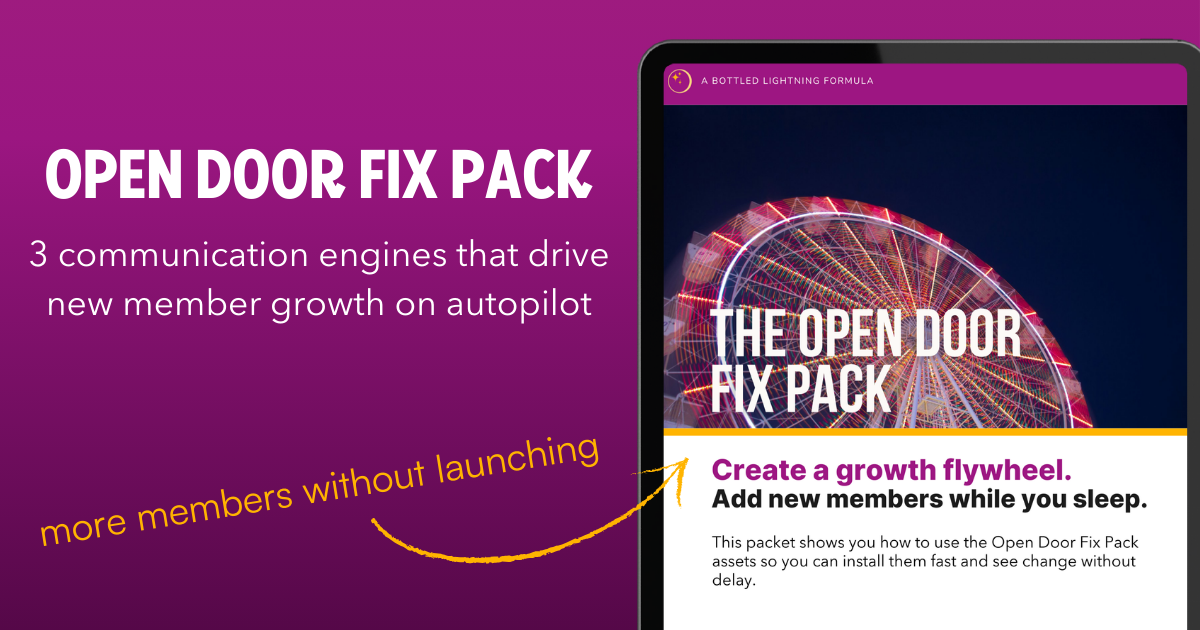 The Open Door Fix Pack gives you three simple communication systems that turn what you are already doing into steady, sustainable membership growth.
