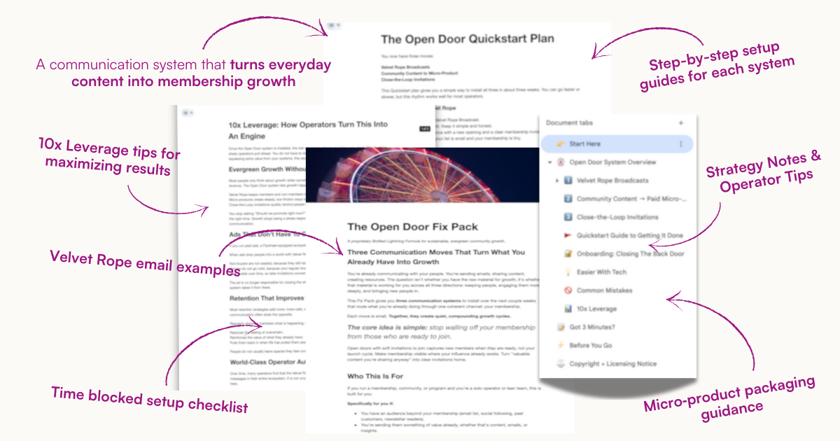 You are already emailing, posting, and creating value. The Open Door Fix Pack simply makes sure those efforts point somewhere clear. Even a handful of new members from a tiny list can pay for this many times over.